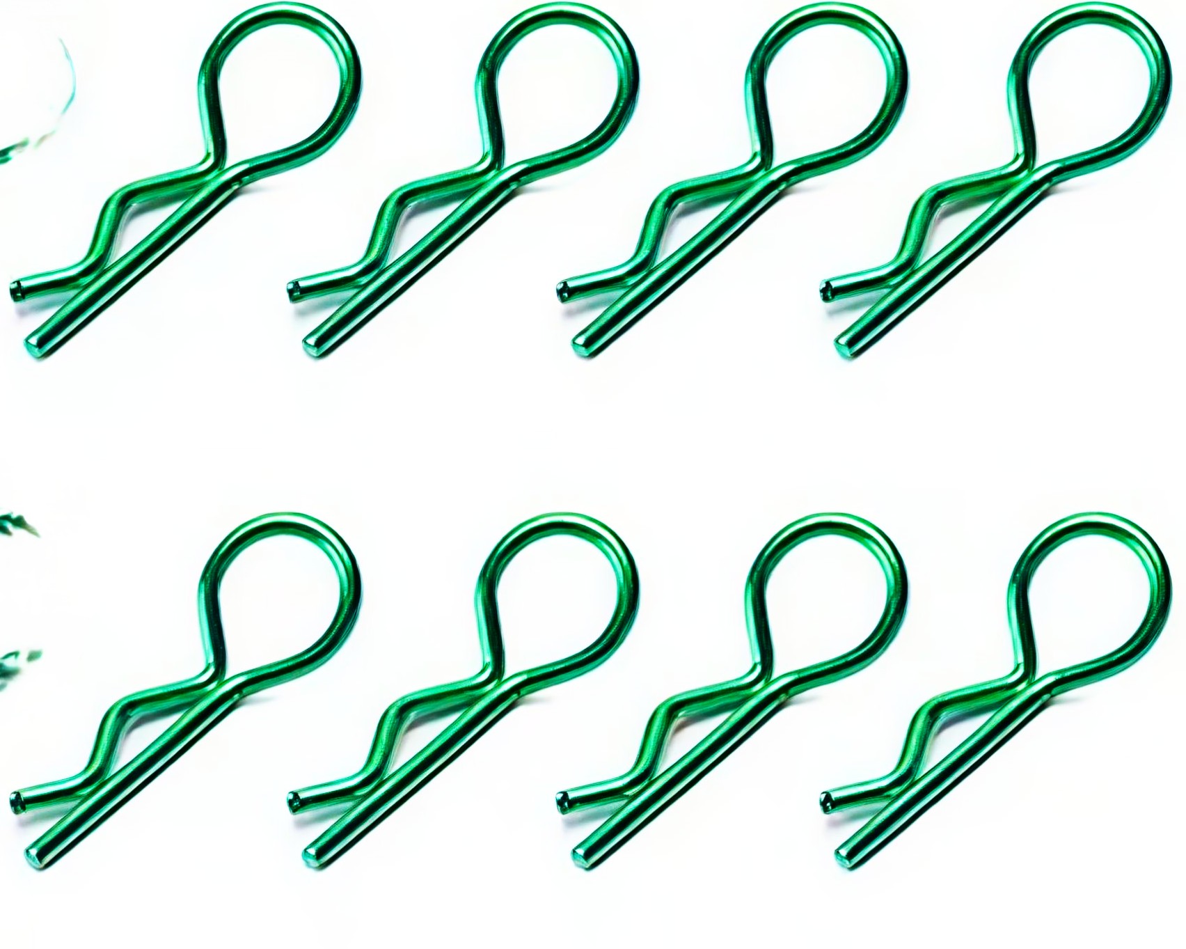 Os grampos são produzidos em metal com acabamento em pintura verde, garantindo durabilidade e resistência à oxidação comum em ambientes de uso do hobby. Com 22 mm de comprimento, oferecem segurança na fixação da bolha do automodelo para garantir bom desempenho e estética.
